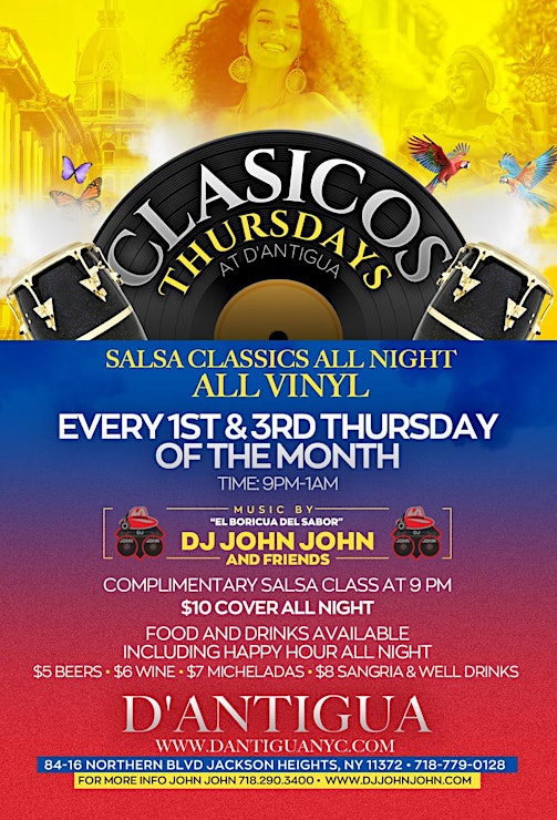 We are super excited to invite you to CLASICOS THURSDAYS at the legendary D’Antigua at 84-16 Northern Blvd in Jackson Heights/Queens every 1st & 3rd Thursday of the month as we feature the best in salsa classics in vinyl from the best DJ’s around including your host “El Boricua del Sabor” DJ John John.