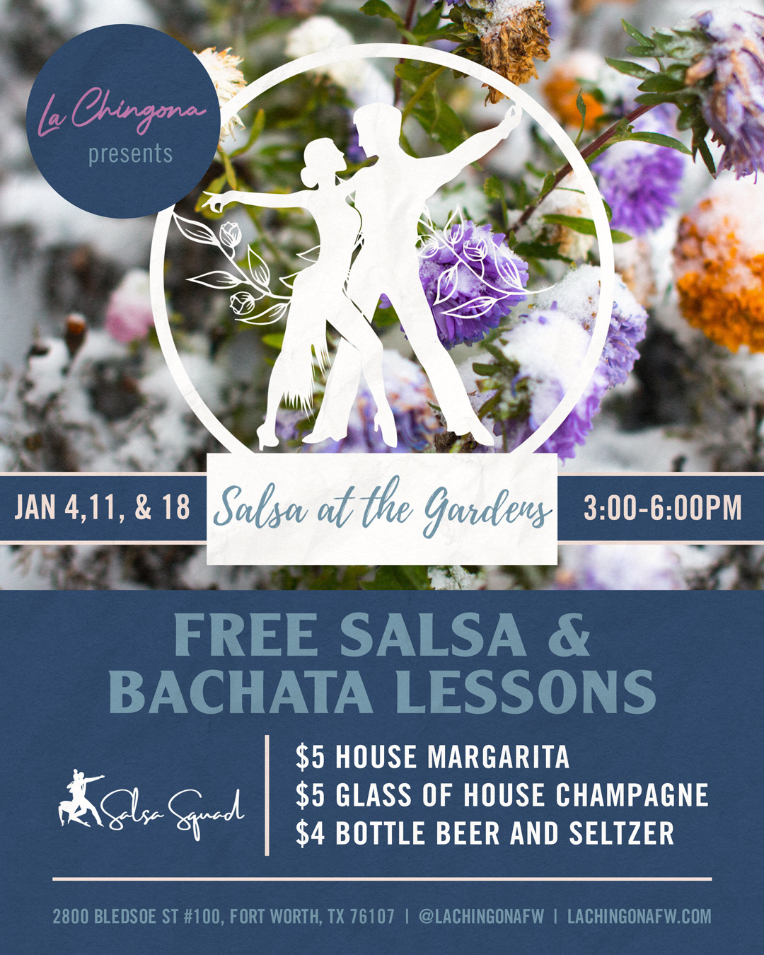 Join us for Salsa Sunday at La Chingona in Fort Worth and enjoy an afternoon of Latin dancing! The event will take place from 3 PM to 6 PM and feature salsa and bachata rhythms. Whether you’re a seasoned dancer or just starting out, this event is perfect for anyone looking to have a great time. You don’t need to bring a partner to join the fun. Dance lessons begin at 3 PM. You will be among some of the most talented individuals in the dance community, ensuring an amazing experience. This is a FREE EVENT, giving you the chance to meet new people and enjoy yourself. See you there!