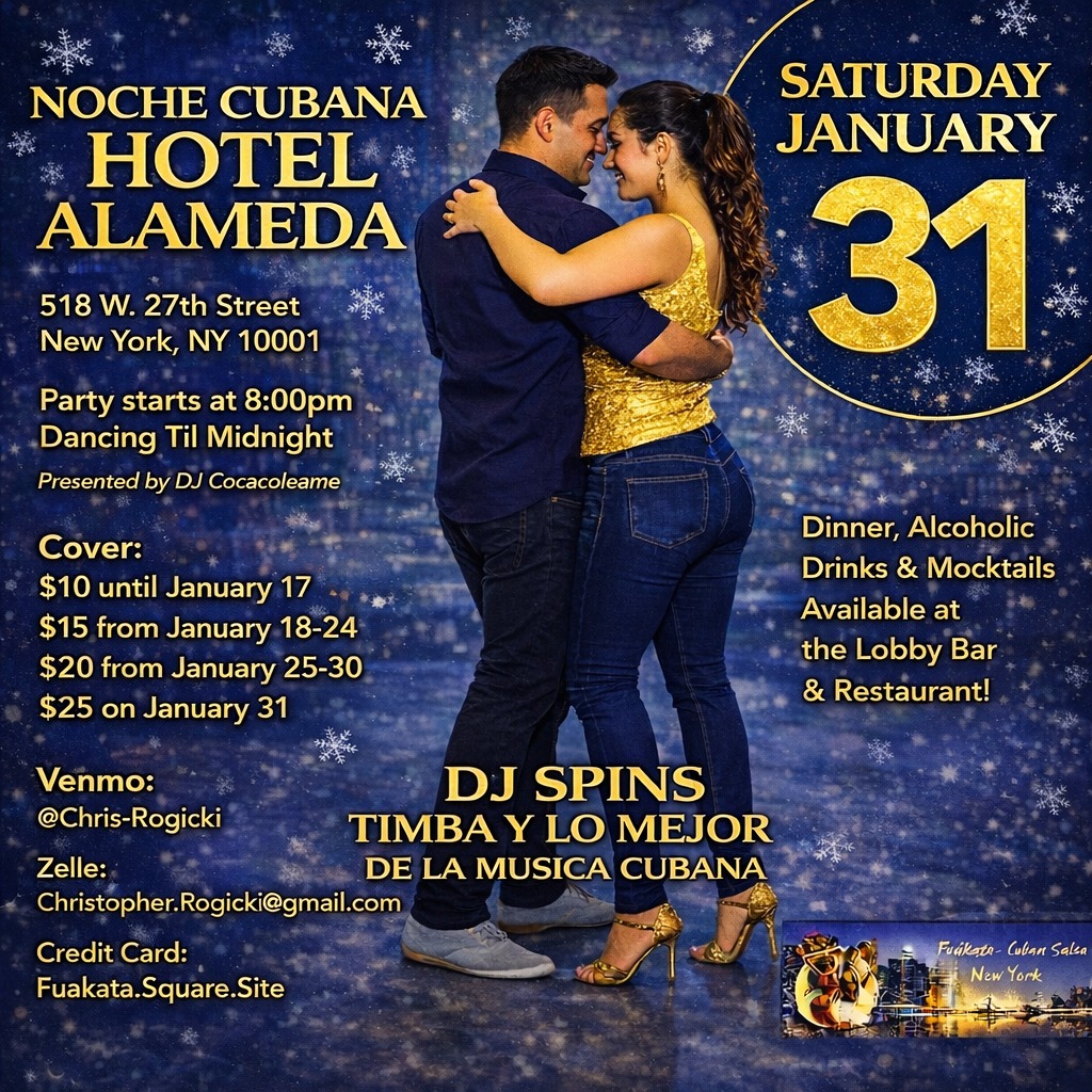🇨🇺 Special Edition Winter Noche Cubana 🎉 🗓 Saturday Night, January 31st 🪩 🕰 8:00pm – 12:00am 📍 Hotel Alameda 🌟 518 W 27th Street New York (Chelsea/High Line), NY 10001 💻 https://www.hotelalameda.com/ Dance away the winter blues with some lively Cuban Salsa dancing at our Brand New Party Venue! Whether you’re a seasoned dancer […]