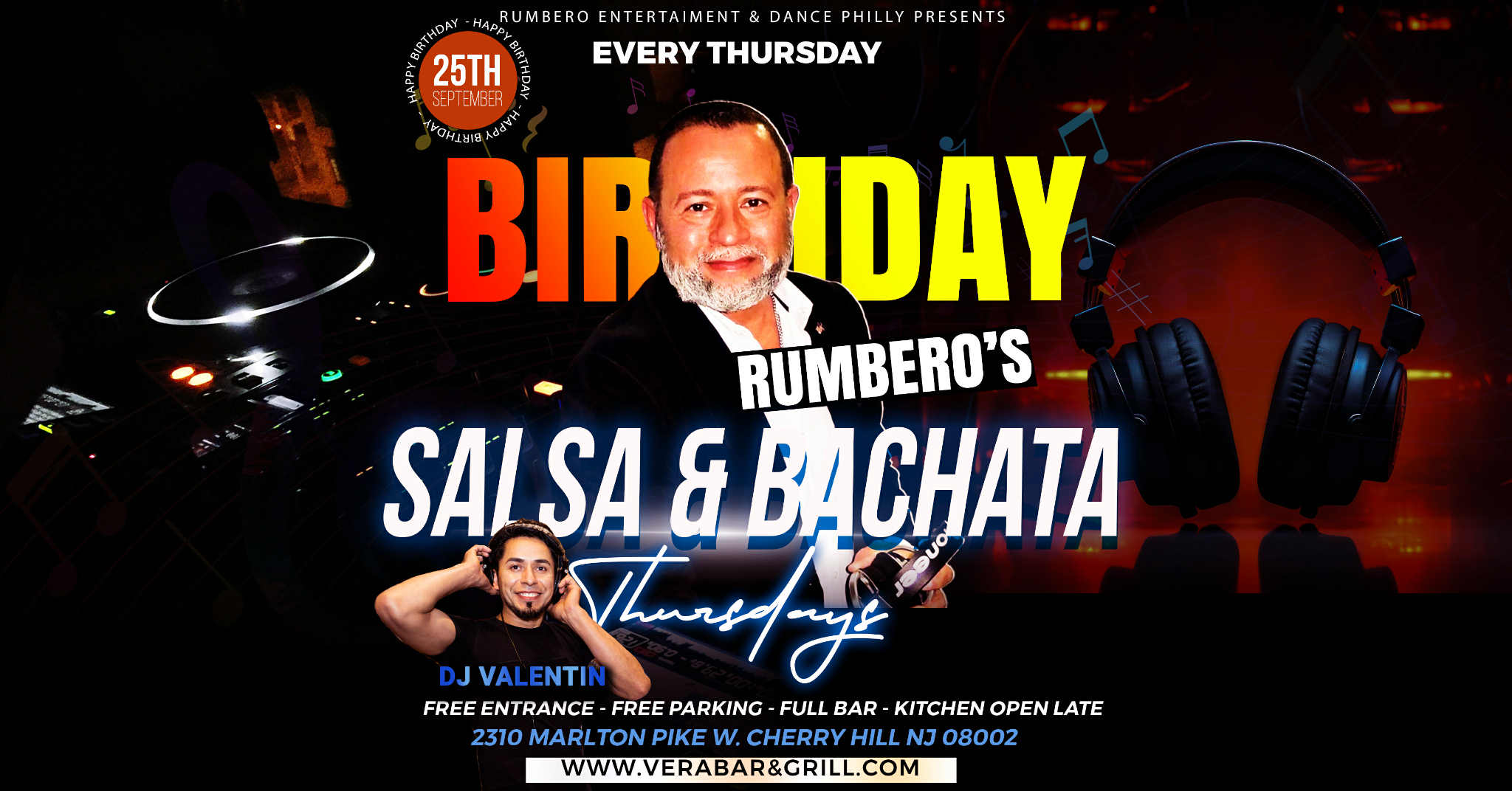 Vera Cherry Hill & Rumbero Entertainment Presents Salsa & Bachata Thursday’s Hello Salseros & Bachateros, Join us each & every Thursday NITE, for the BEST in Salsa, Bachata, Y MAS! DJ Rumbero NO lesson, strictly DANCING! FREE COVER FREE parking Food available Vera Cherry Hill 2310 Marlton Pike W Cherry Hill, NJ 08022 (856) 486-1001
