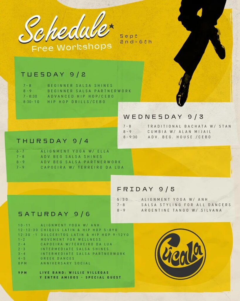 Free class week at Cucala Dance Company! Salsa, bachata, hip hop, house, cumbia, tango & more! It will all culminate with our 3rd Year Anniversary bash Sept 6th! Live music […]